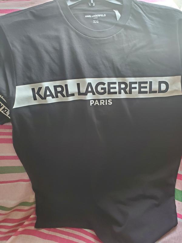 This Karl Lagerfeld Paris shirt is super comfortable! I got this in a size large and it fits true to size. The front has "Karl Lagerfeld" in black capital letters, and in a white border background. Then "Paris" in white letters underneath that. The sleeves on both sides have "KL" in black letters with the white border going all the way around. It's designed very sleek and different, which I really like! The material is very soft and lightweight. The quality of the material is fantastic too! This will go great paired with anything, and for so many different occasions! Definitely recommend!