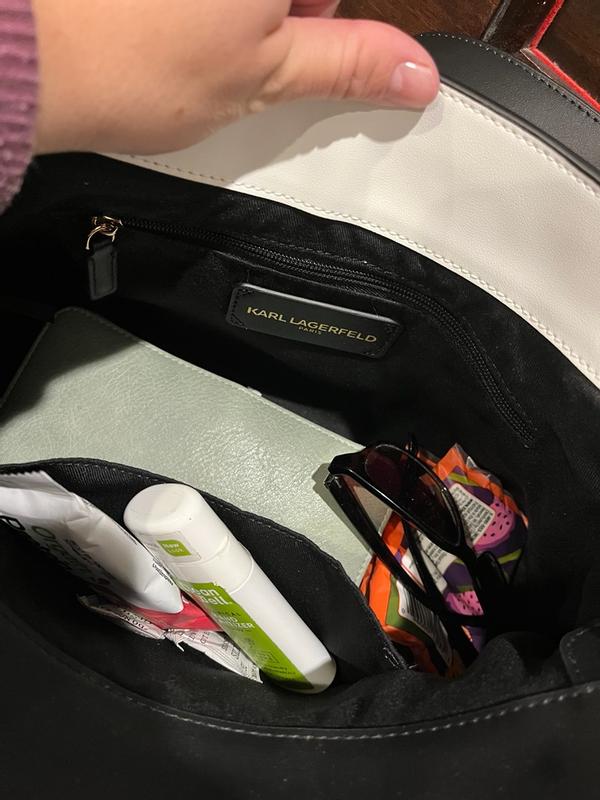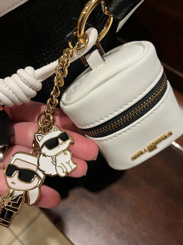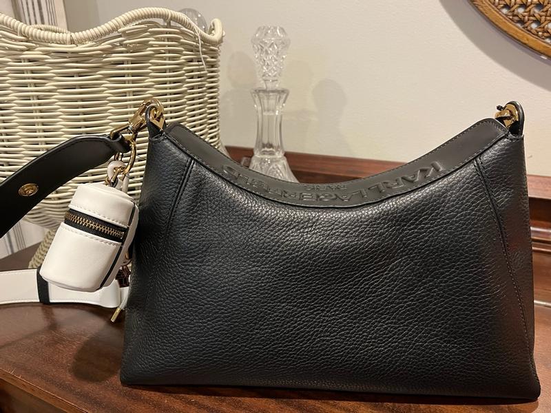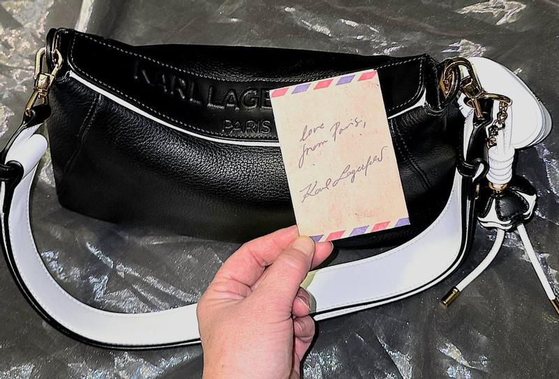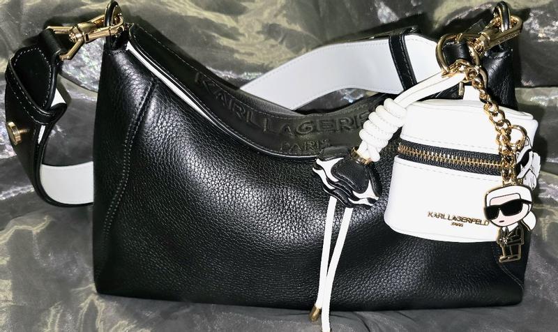 This has got to be the nicest handbag I have ever owned! The genuine leather is so soft and durable, definitely a timeless material. The straps are comfortable and easily adjustable as well. The magnetic closure is so convenient and unique, no more fighting with a zipper. The accessories that are included are so modern as well- the ear bud case has a hole for a charging cord and the cat and Karl are adorable as well. I can easily keep everything organized and I have so much room! This would be great for traveling with or just to use on a fashionable night out.