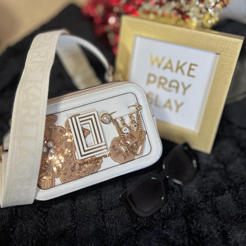 I received this product from Influenster in exchange for my honest review. This is absolutely the cutest purse ever!!. The designer put a lot of details in the design. This purse is so beautiful with it's sequined flowers, pearl buttons, hanging chains and the embellished safety pin. The straps are sturdy and high quality. If you don't want to pack it as a crossbody. You can detach the strap and carry it as a handbag. It has different compartments and is more spacious than it looks. On the inside there is credit card sleeves built in. This purse came with an autograph signed dust bag on the inside. The designer even enclosed a special note about his design. This is by far the most expensive purses I've ever owned. Thank you Influenster for this product.