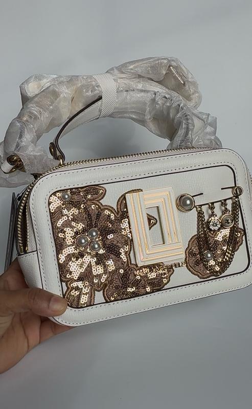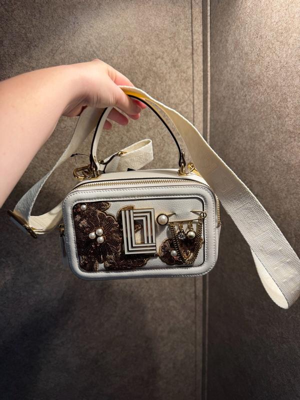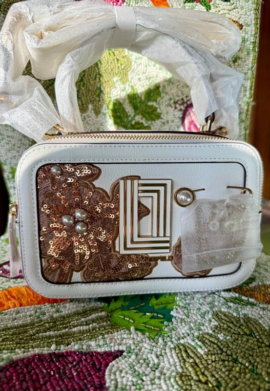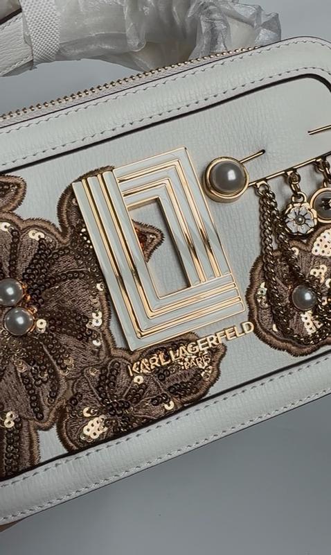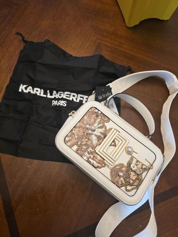 Karl Lagerfeld Simone Camera Crossbody Bag, adorned with a sequin flower design and pearl and gold embellishments, is one of the most exquisite bags I own. It doesn’t fit camera but has the size of a camera. This 8X5X4 crossbody bag features an adjustable removable cloth strap and is available in a crisp white color. I particularly enjoy bags with multiple zippers and ample space. Its compact and charming design makes it an ideal accessory for your next party. Its white, so I need to take extra care of it. There was no smell in and out of this appropriately weighted bag. Quality and aesthetic is really beautiful.
