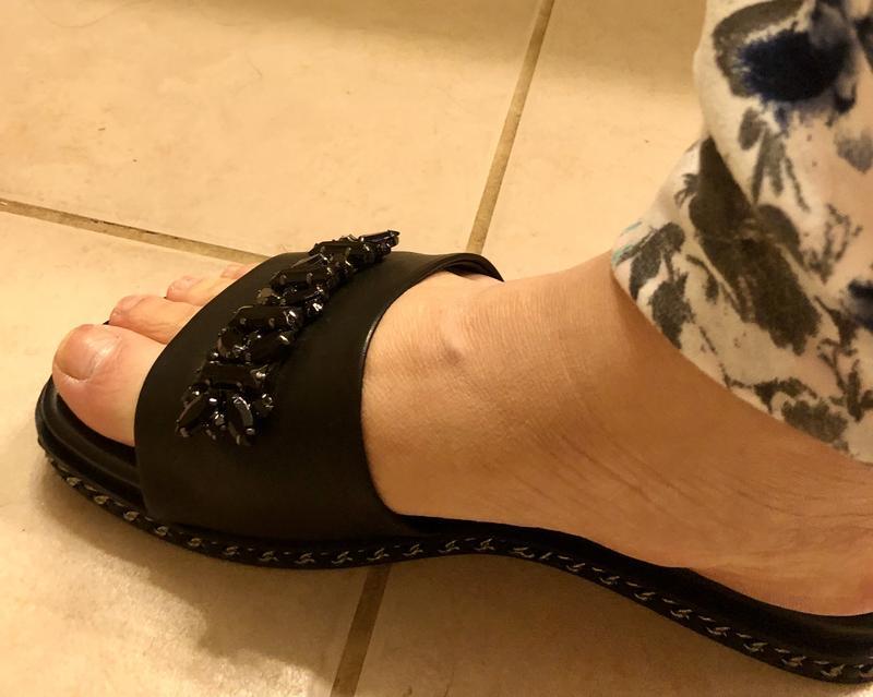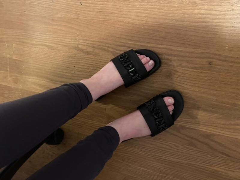 These are really well made and have cushy pads and thicker soles than most slides. They do run a little short. I’m a 7.5 and the 8 fit better for me. They stay on my feet well and are much better looking in person because of the quality they are. The black is a nice deep color and they are a nice casual or dressier option for warmer weather. My only dislike was they curve inward more than I’d like but by sizing up to the 8 helped. Overall, very comfortable and stylish so I’m very happy with them!