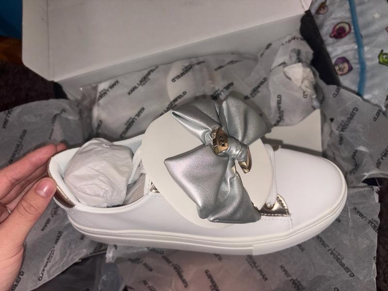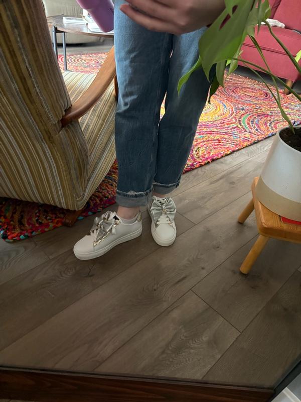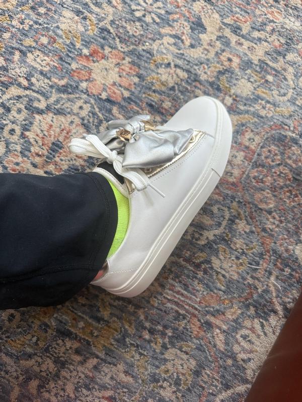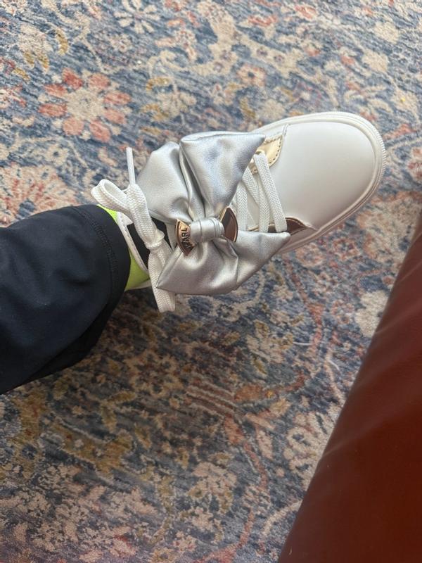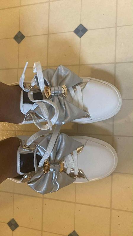 The shoe is super stylish. You can dress it up dress it down I believe you can also take the bow off the shoelace if you wanted to it’s gold white and silver and couldn’t really dress it up with a perfect outfit. Pretty comfortable and true to size!