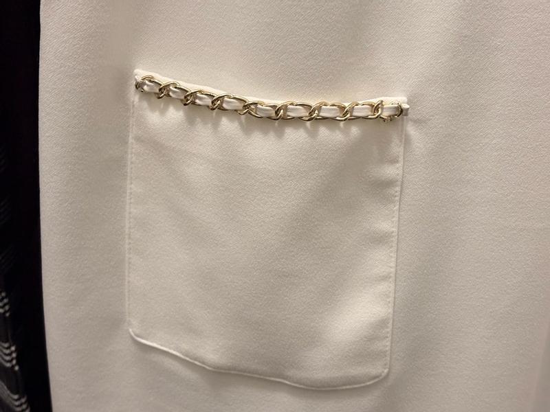 Wow! Fabric is super lux and feels like it was made with such quality! I love the gold chain work and how it can be dressed up or dressed down! Neckline is a perfect fit and the sleeves aren’t too tight! Fit is great!
