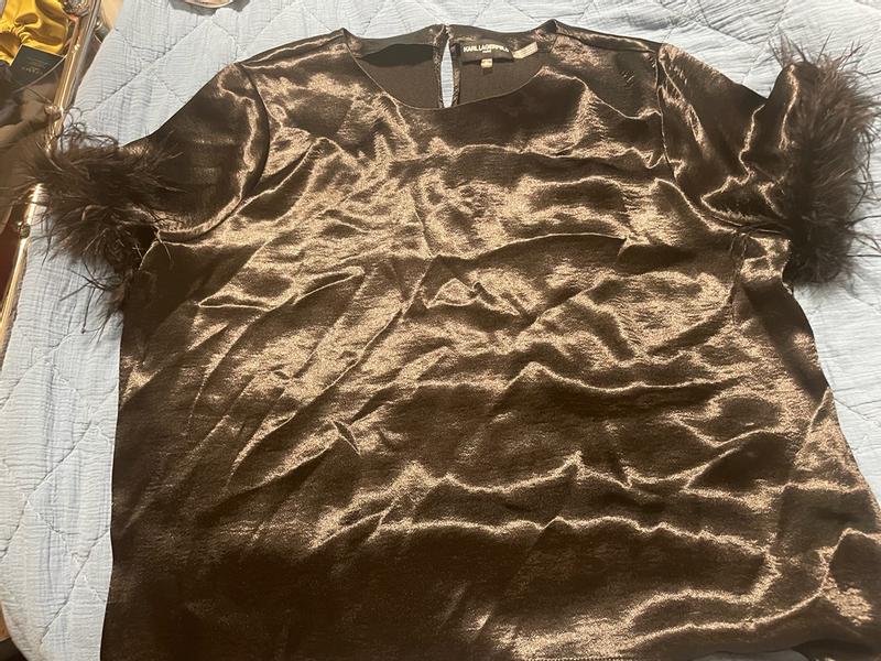 This black blouse is very silky, with a flare of feathers. Perfect for a semi formal dinner w a fancy skirt. I usually wear a small but purchased an XS, fits perfectly.