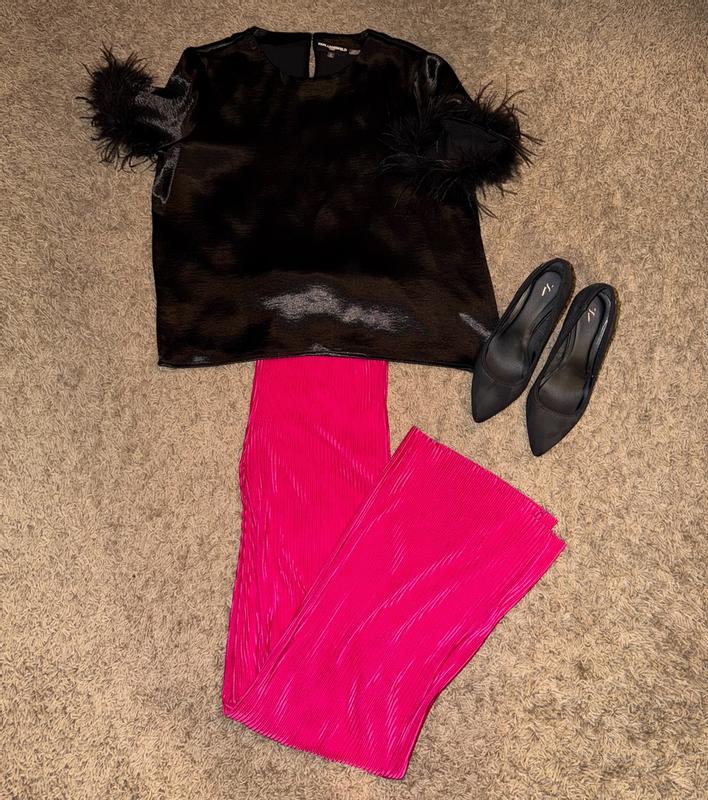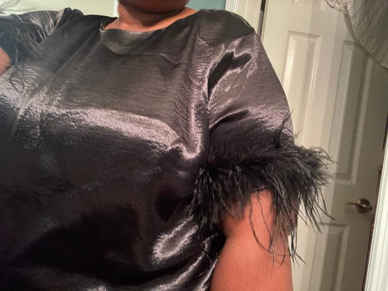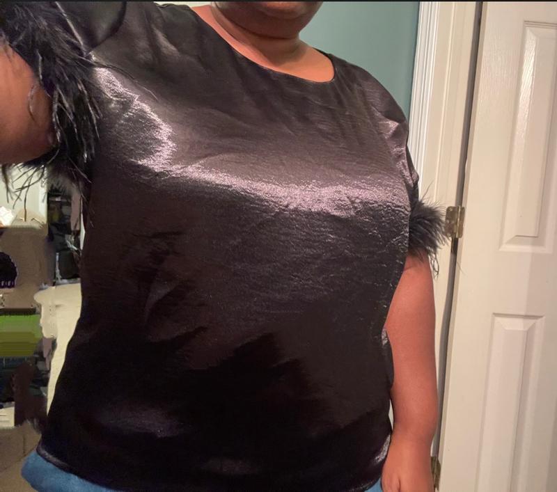 For the holidays, the feather trim and the sheen would be perfect. It would go well with jeans, leather pants, or a ponte pant. One of the things I was not too keen on was the fit. I didn’t like that it fitted close to the waist as opposed to falling loosely. In addition, the armhole was trying as there was a hole also where the feathers connected to the sleeve. Overall, the shirt is nice but the fit could be better.