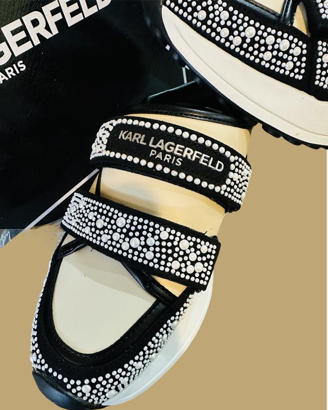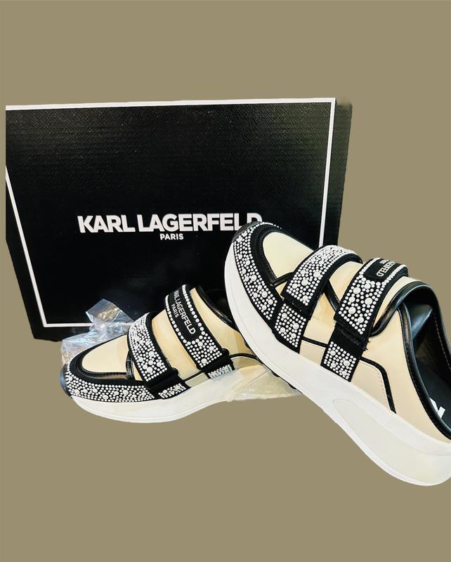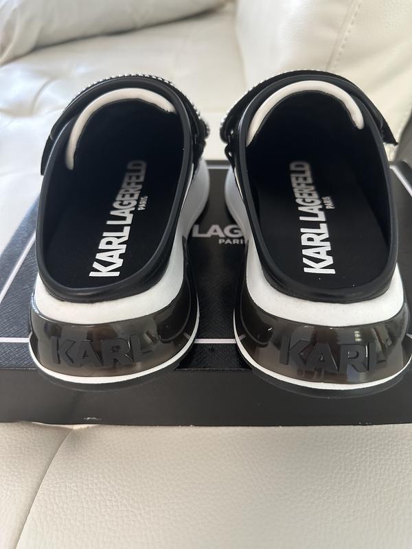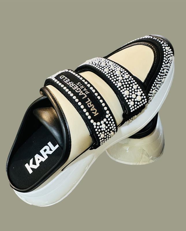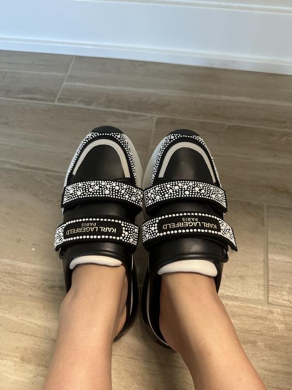 These Karl Lagerfled sneaker mules are stunning. They are bedazzled with pearls on the velcro straps and perimeter of top half of shoe. Love the additional height I get when wearing the shoes. True to fit. Under the pearl velcro tabs, you can adjust the tongue of the shoe so that mule will fit more comfortably. Sole of shoe is thick and good quality. Love the Karl Lagerfeld logo on the top strap and the KARL logo on backside of the sole. Cute and chic mules for wearing when going out and you want some snazzy on your feet! I already got compliments when wearing them the first time this week!
