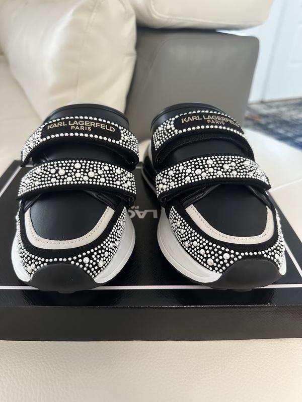 These Karl Lagerfeld sneakers are very cute.They are black and white and have little faux pearls on them. The pearls are glued on securely to the shoes, and it does not seem like they will come off easily.The shoes have two velcro straps to secure them. The shoe is backless, so they aren’t good for walking in. These shoes are meant to be worn at parties and events were you will not have to move much. The shoes do have a tendency to slip off, so be aware if you decide to go out in these. I love these shoes, but I do wish they had a strap or some other closure towards the heel. These shoes also run small so order one size larger.