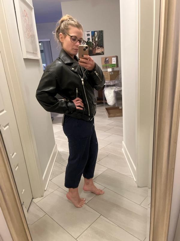 This asymmetric cropped moto jacket is true to the faux leather look. It’s comfortable and moves with you so it isn’t stiff in movement. I think it’s pretty true to size with some room to even wear a hoodie underneath if you want. I think my only gripe with this jacket is the belt. If you don’t buckle it, it’s just hanging pretty loosely but it is stitched in the back so it can’t come off. Very durable looking material and even when it gets wet, it doesn’t ruin the look or texture, which is great when you live in a city with multiple seasons of weather in a day, lol. It’s lightweight so it doesn’t feel extremely heavy and very versatile.