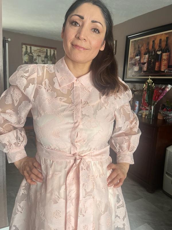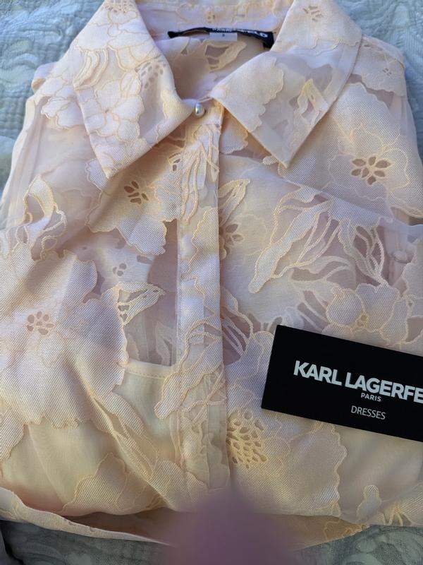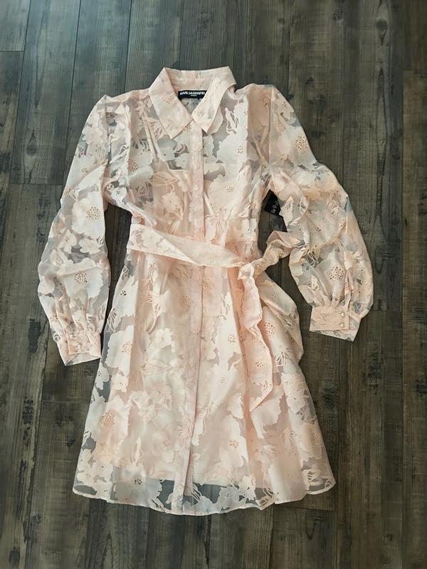 This Floral Organza Fnf shirt dress by Karl Lagerfeld is absolutely darling! So pretty so feminine. The lace detail, the pearls, the shade of pink, everything about this dress is just perfect! It fit me just right, not to tight not to loose. This dress is perfect for Easter, Mother’s Day or any occasion quite frankly!