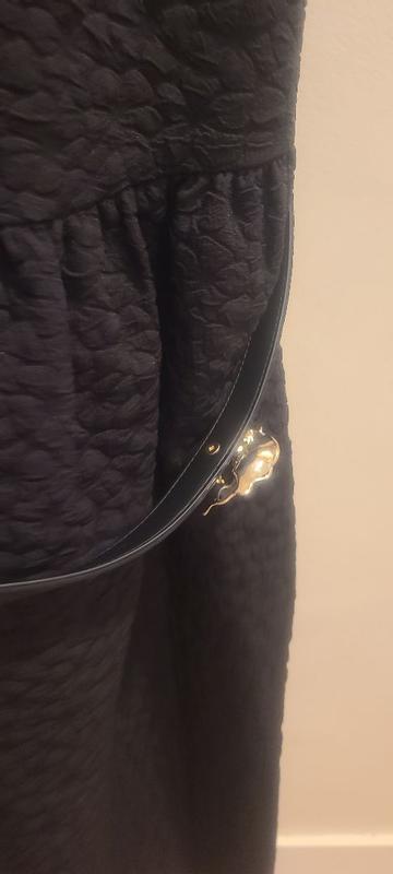 This crew neck mid length dress in black is elegant and high end.The gold flower adds so much glamor and class to this nicely stitched dress with quality fabric.The zipper makes the fitting perfect and is invisible so it would not ruin the look of dress.The dress is perfect for social gathering and we can accessorize it to make it more or less glamorous according to the event.