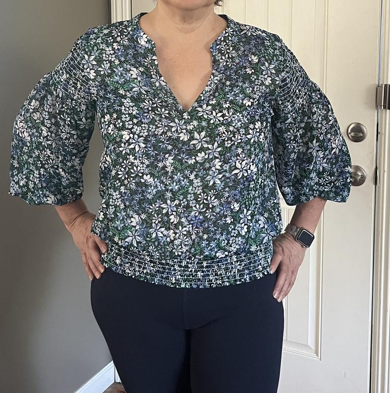 Such a pretty top. True to size. Light weight so it can be worn alone or under a blazer. It’s very well made, the elastic is not tight, so very comfortable. Pretty colors!