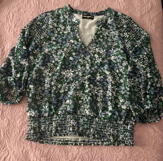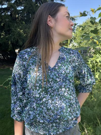 This is a lightweight, colorful blouse that has cute smocking and other touches. It would look great with some white or black pants, as well as with jeans or shorts to dress them up a bit. Love it!