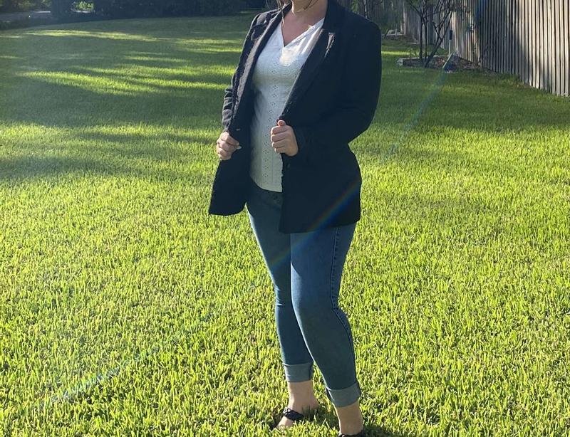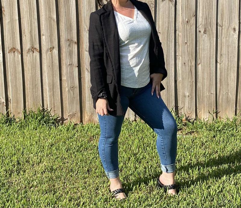 Beautiful classy blazer. Can’t wait to wear it. Can be dressed up or dressed down with jeans. I sized down and fits perfectly.