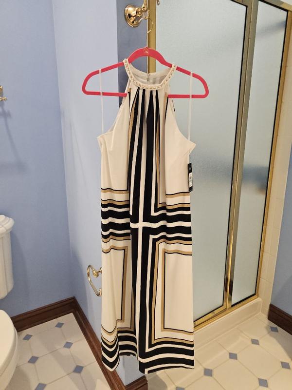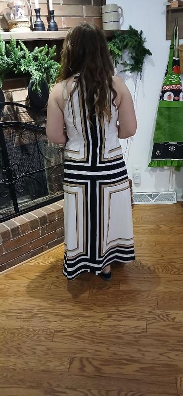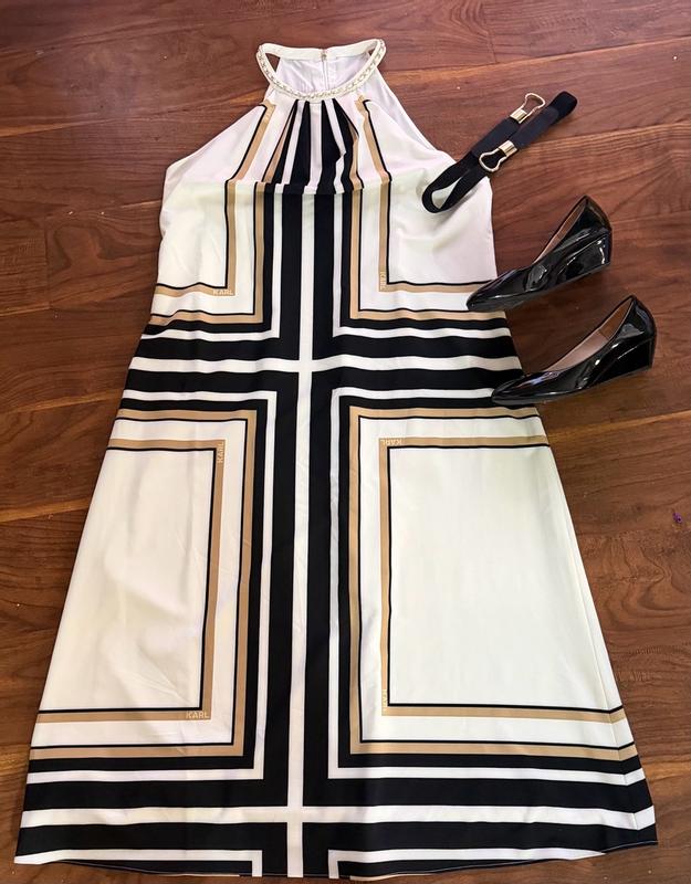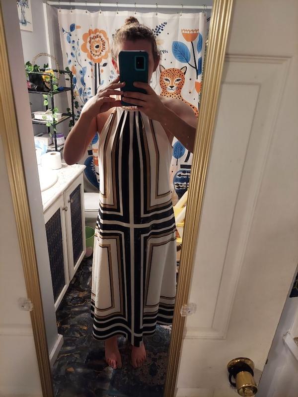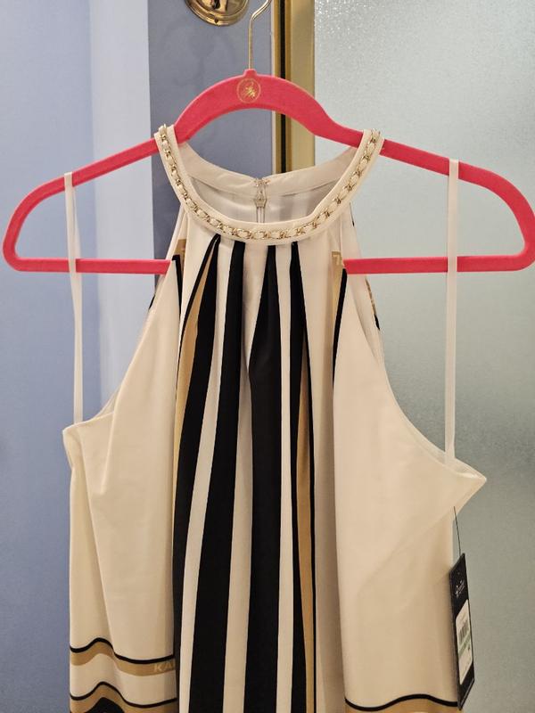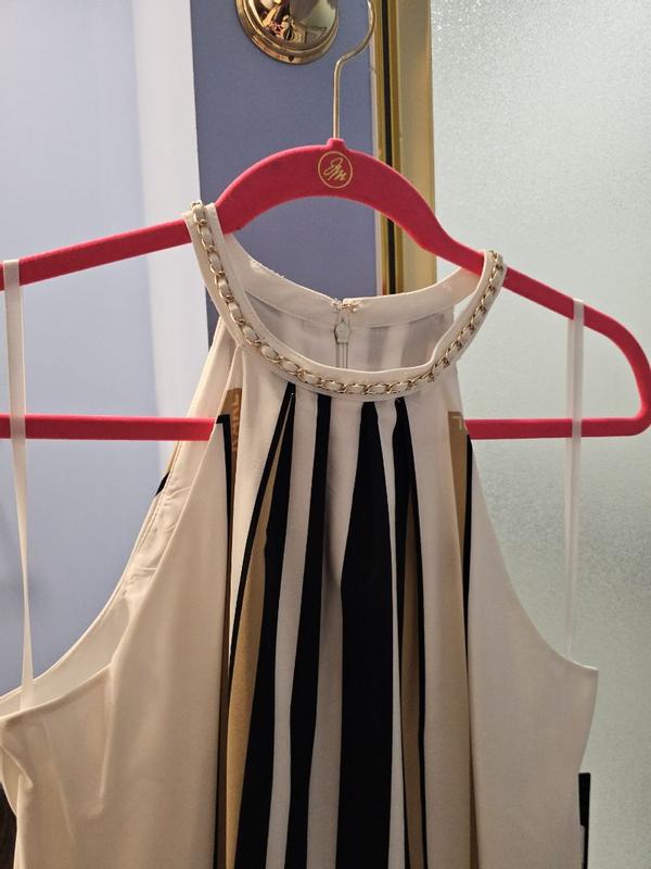 I am super in love with this dress 👗. It has a very unique yet stylish pattern and the material is so soft and silky it seems to glide across my skin. I love the nude colors it came in and the fit is just perfect 😍. The chain around the neck area makes it stand out even more. Length is a little long but I’m short so that was to be expected but it was an easy hem fix. There are no pockets which is fine it’s a dressy dress but I think I like this brand