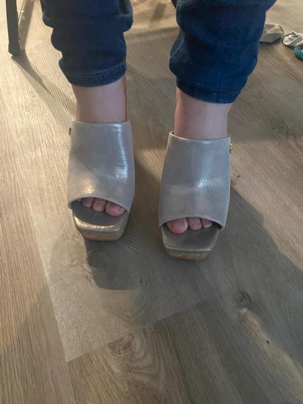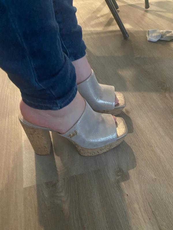 This platform sandal is soft and comfortable. It is made with metallic suede. This designer brand sandal goes with everything, from casual to more formal occasions. I would recommend this sandal for anyone looking for a comfortable platform sandal.