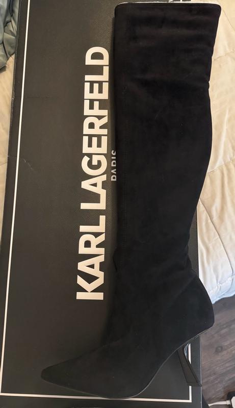 These Karl Lagerfeld boots deliver a sleek, sophisticated style with their elegant over-the-knee design and pointed toe. The fit is snug yet comfortable, offering good support around the ankle and calf without feeling restrictive. The suede material feels durable and well-crafted, while the inner zipper makes them easy to put on and take off. Comfort-wise, they’re suitable for extended wear, with a moderate heel height that balances style and ease. A chic and versatile choice for both casual and dressy looks.