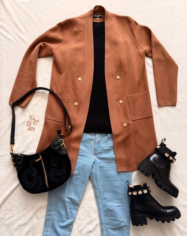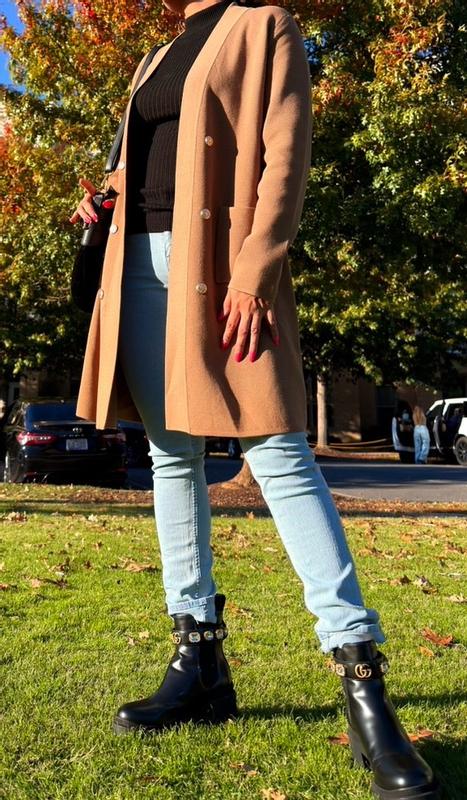 This cardigan is my new go-to for autumn. The material is smooth and you can really feel the quality it’s constructed with. I especially love the design on the gold buttons that add a nice pop to your outfit. The length works great with pants or shorts for a variety of looks. It’s slightly oversized for that nice cozy look. Overall it’s a great addition to your wardrobe for the fall season and goes great with neutral colors.