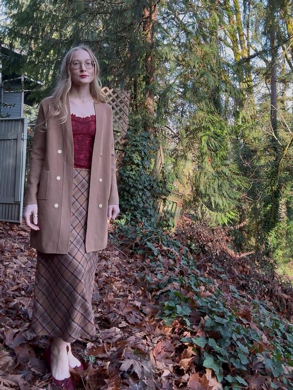 I have mixed feelings about this cardigan. I got the XS and still feel that it’s a little boxy/bulky on me, I wish it felt a bit more fitted/true to size, specifically in the back because it looks big and this also makes it feel a bit less cozy. The fibre content is 70% viscose, 30% polyester, and it feels pretty heavy weight and has a pretty nice drape in the front, and the pockets are sturdy enough to hold my iPhone without dragging the entire sweater down (not that a bulky phone is flattering in the pocket, but it can fit). The buttons are very secure and low profile, yet blingy. I think overall this sweater has a pretty classy and dressed up look. I actually thought I was getting the black one, so I was surprised with the Vicuna, which isn’t a color I would usually pick for myself. But I actually like it better than I thought I would and it’s a nice fall layering piece that isn’t too warm. I haven’t washed this item yet because it hasn’t been necessary and because it must be hand washed, in cold water. I am a little nervous that because of the garments viscose content, washing will alter its appearance and that it is susceptible to to shrinking. Because of the extra care needs this is not likely to be an everyday cardigan for me, but I’m planning to wear it for thanksgiving and similar events.