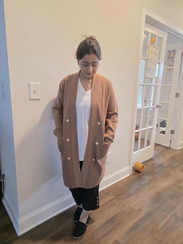 Loving this stylish cardigan this fall season which keeps me warm and looks great at the same time. The open front style wjth golden buttons and 2 pockets on each side gives a very fashionable look and at the same time very convinient and easy to carry.