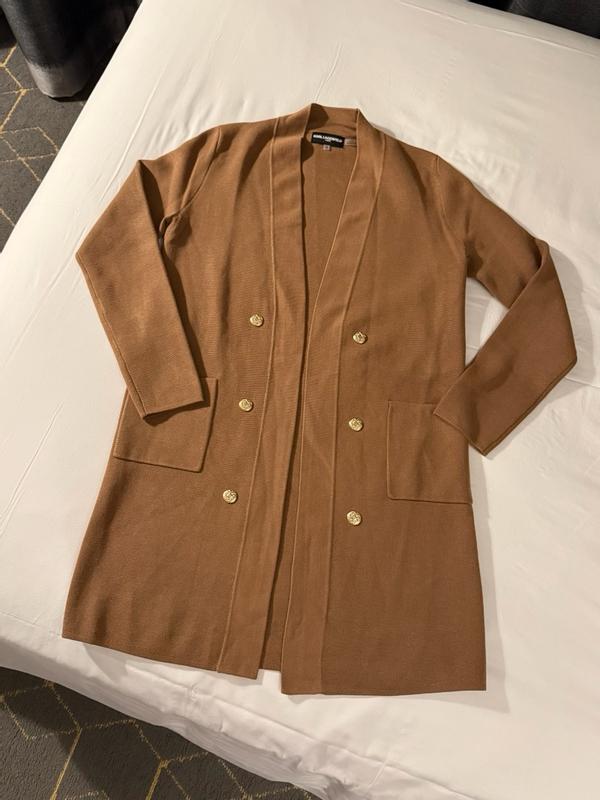 The Karl Lagerfeld Long open Cardigan is great quality . It’s beautiful and very fashionable . Only problem is that I am very short and it’s a bit too long for me but otherwise it’s really pretty.