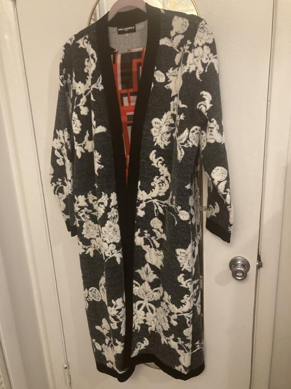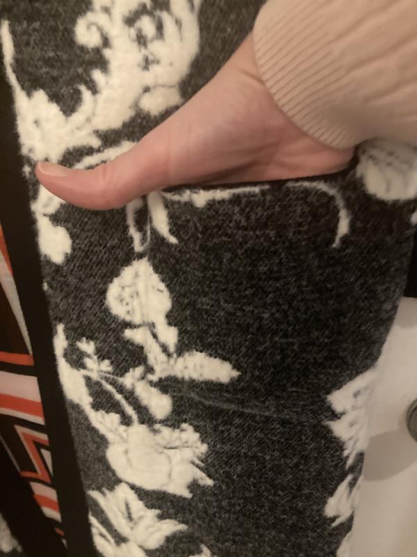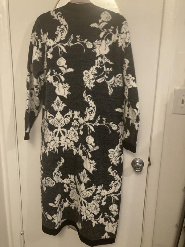This is a substantial sweater, not a thin little topper. Two pockets, 6 inches deep & 5 inches wide, so fits most phones, keys, lip balm, IDs, etc. It is open-having closures would make it close to perfect for me. I got the XL, as it didn’t lay as open as the L. The sleeves felt the same on both sizes-loose-the sleeves are not tight, which is nice. I love the pattern. This is a distinctive unique sweater. I’ve always liked long sweaters, but patterned one that I like are hard to find-until now! I usually wear a size 16-18.