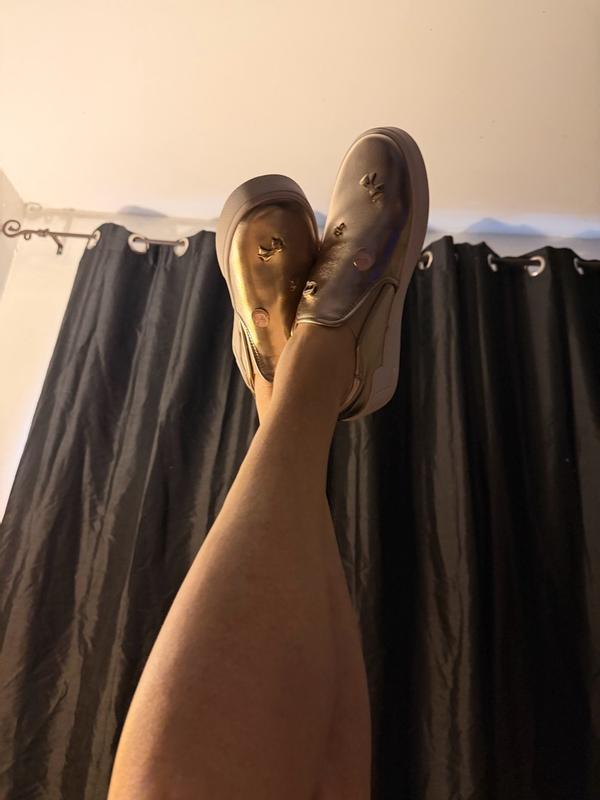 Super comfy slip on, I used them all day long for shopping day and I felt comfortable at every step. Also stylish and beautiful gold tone with cute pins.