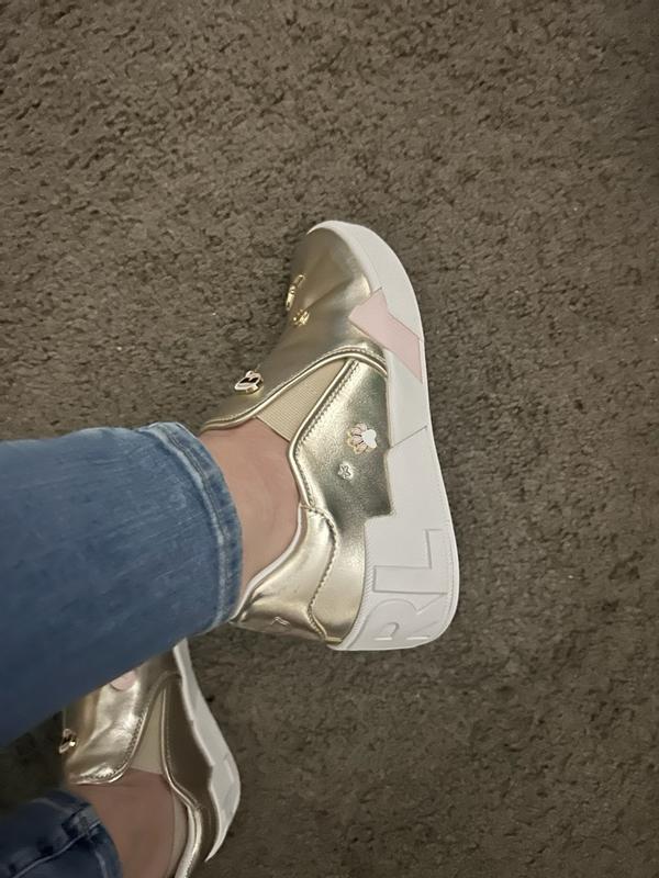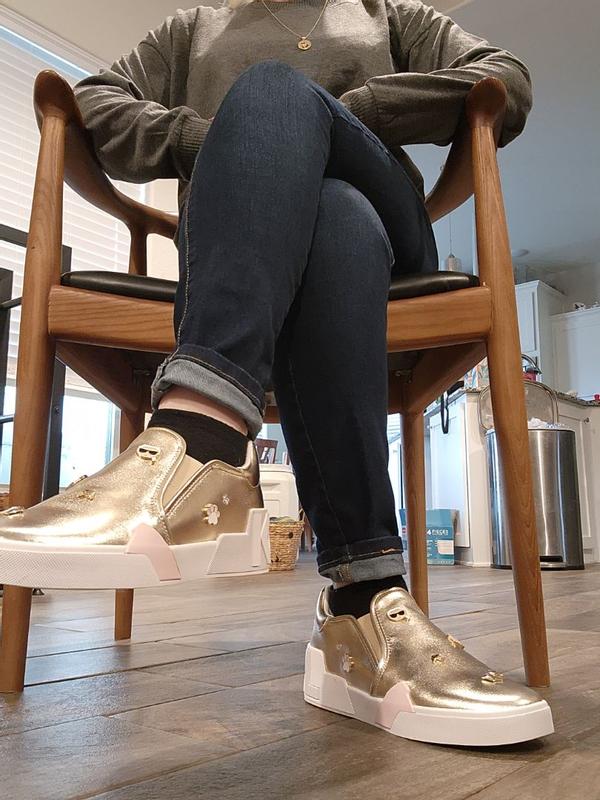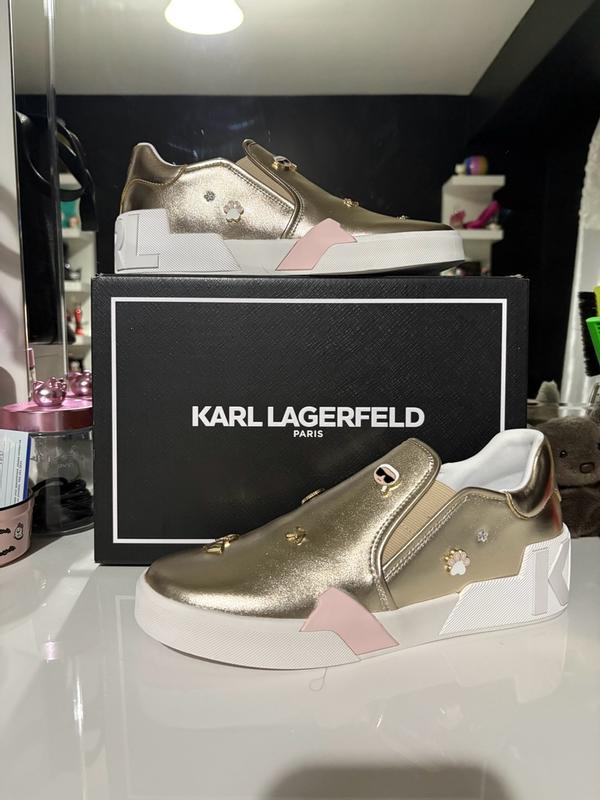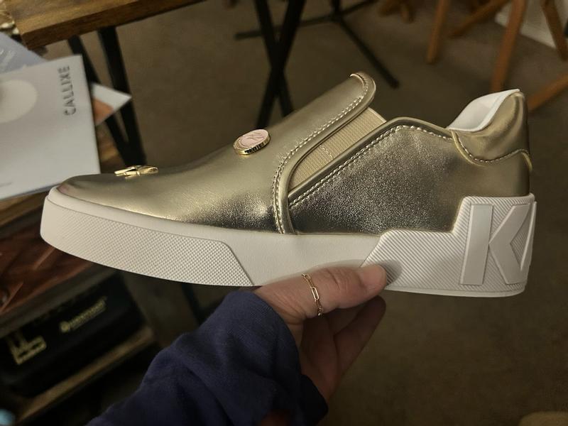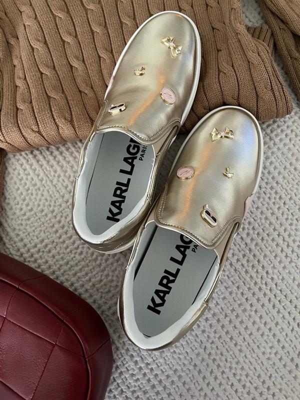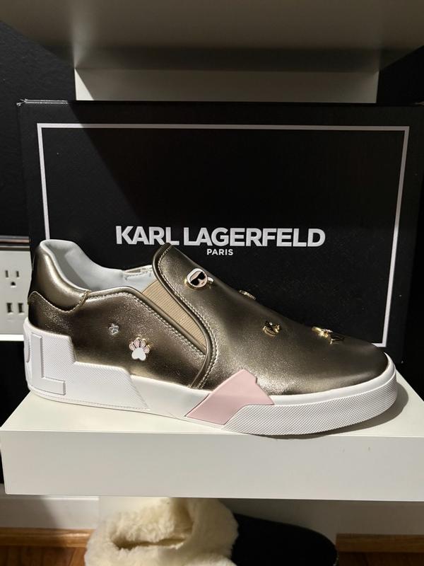 The Karl Lagerfeld slip-on sneakers are comfortable and so stylish. I like how breathe-able they are and not super tight were they hurt my feet. Very easy to slip on and head out the door. At first I thought the gold was too shiny and flashy but once you put them on with a cute outfit they actually are very cute on and not so flashy. I love the design of the shoe with the cute Karl Lagerfeld pins on the shoes. Very impressed.