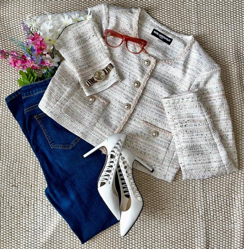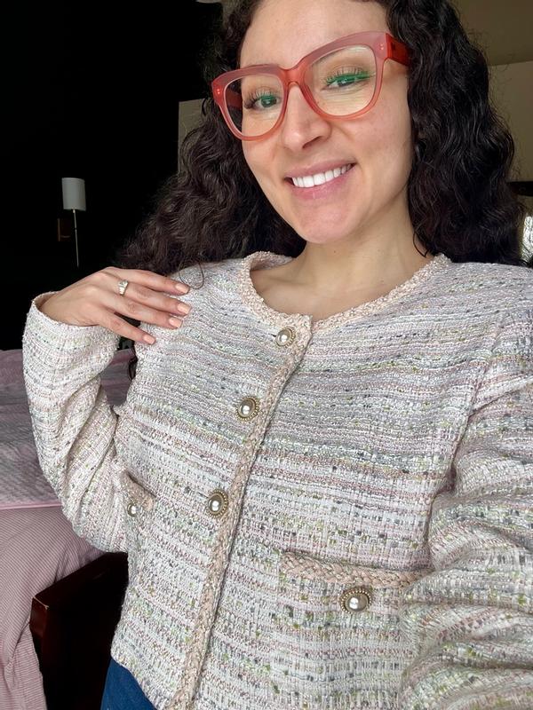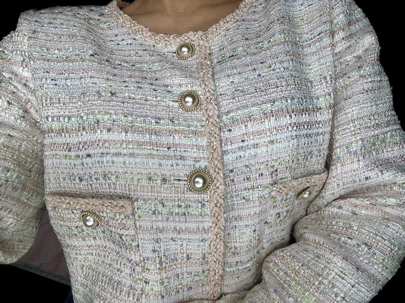 This tweed jacket is absolutely gorgeous and of high quality. The colors are pink, grey, white and lime green which feels perfect for spring. I opted to size up a bit so it wasn’t too tight and that was the perfect decision for me. My arms can move freely without feeling constricted. The material is not stretchy so keep that in mind. It does have shoulder pads which broadens your shoulders so keep that in mind as well. The buttons are absolutely gorgeous and the pockets are functional. Due to the material, I recommend dry cleaning and wouldn’t subject it to machine washing just to be safe. It has the potential to wrinkle and fray if you do machine wash. Im super satisfied with this piece and so grateful I got to try it out. It’s perfect for brunch, Mother’s Day, Easter or church and you can style it in a variety of ways. It is on the shorter side so it’s not a very long jacket.