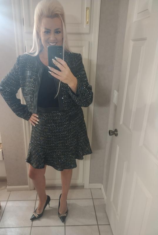 I bought the jacket to wear with the same fabric dress. Jacket size 8, one size larger then the dress. I am 125 lb and 5'5". The jacket is too wide, it is better to take the same size as the dress.