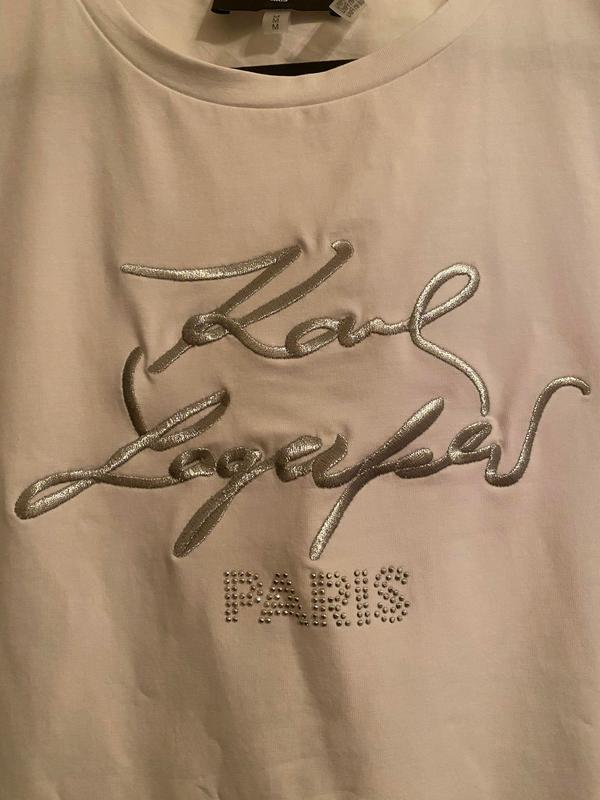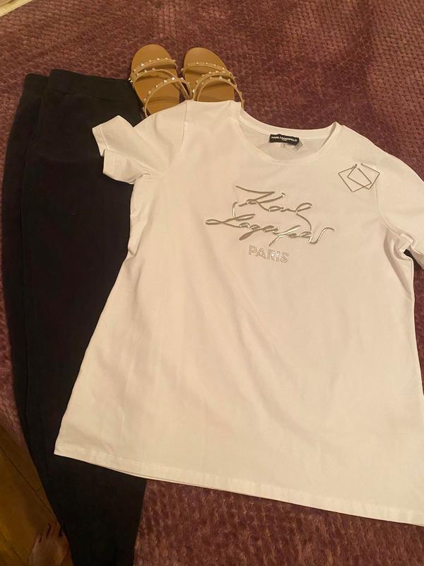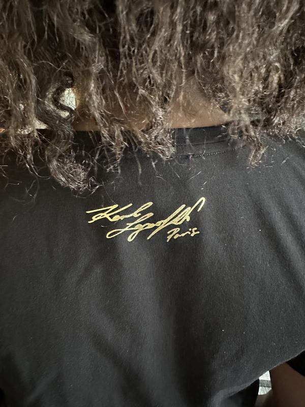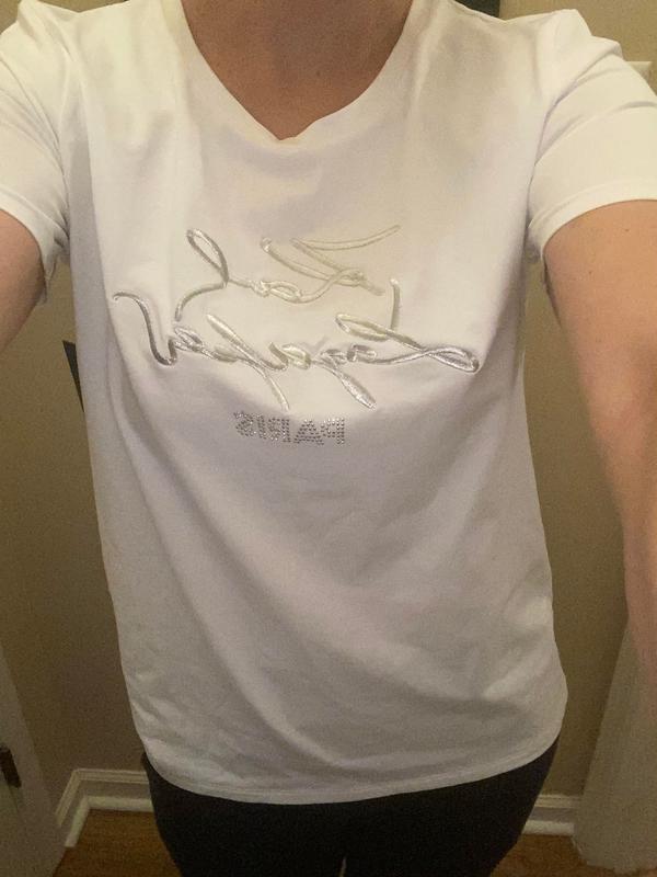 The Karl Lagerfeld T-shirt is very comfortable and stylish. The T-shirt fits true to size and it did not stretch, nor fade after several wash cycles. I received numerous compliments when I wore the T-shirt. Yes, I would recommend this T-shirt to a friend.