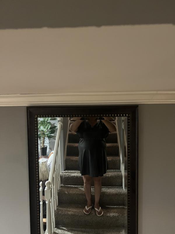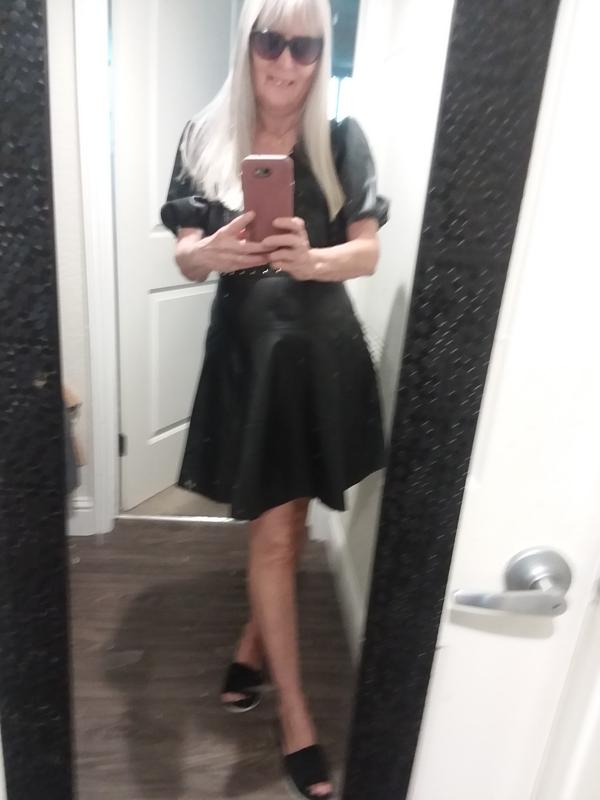 This faux-leather dress by Karl Lagerfeld looks super cute on the hanger, but just isn't very practical. The dress isn't all leather - it has stretchy panels of black fabric to give you some room to move in the back. It's cute on - definitely different - but very impractical. I don't really see where you'd wear this a ton except going out. The studs around the neck and the puff sleeves are cute details - and the dress is more comfortable than I thought. But the dress has a deep V on the front, and it's really short on me. It's so short, it hits above mid-thigh on me at 5'6". Now, I am curvier (definitely have a chest and butt) but still... I don't think I'd feel comfortable going out in this dress unless I had leggings or tights underneath. For reference, the dress from shoulder to hem is 33" long. It's a fun trendy style and I love that it flares at the waist. But I don't see me wearing this a lot of places!