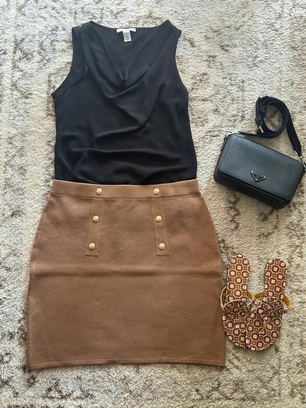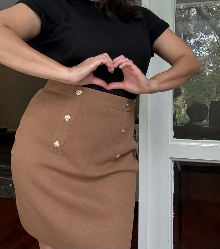 High end brown Karl Lagerfeld knit mini skirt with iconic gold buttons is the epitome of fashion, elegance and comfort. This mini skirt is super versatile as you can dress it up or dress it casual.