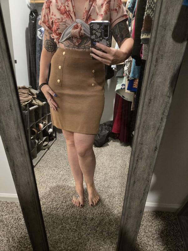 This is skirt is so pretty and is good quality material. The gold buttons add the pop so you can wear a plain top and not look plain. It is very comfortable. I feel like it runs big. I’m a large with big hips and I felt size large was too big. It is cute for dinner, the office, shopping, very versatile. You can wear it with sandals for warmer weather, or boots in cooler weather.