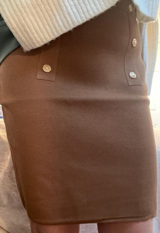 Super cute and comfortable sweater skirt. The buttons add nice detail as well. I appreciate the stretch in the material for added comfort. The color is perfect for the holidays.