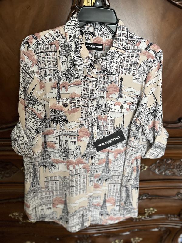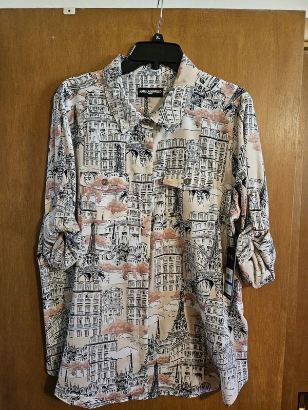 Fun blouse, which sleeves that can be turned up & buttoned, or left long. I love the Paris print, I wore mine for the first time on the first day of the Paris Olympics. Looks great with black or white pants or capris. I normally wear size Large, mainly needed for broad shoulders, and this shirt I selected a Large, but the Medium was very close to being ok, just a touch snug in the shoulders. Wish they had similar prints in a short sleeved version (especially another print that has sunglasses on it). But offhand I'm guessing per the material, it would offer good sun-protection if you wore the sleeves long on a sunny day as well. I would recommend this blouse to others.