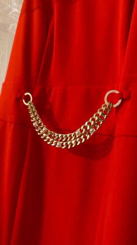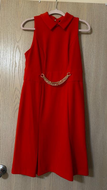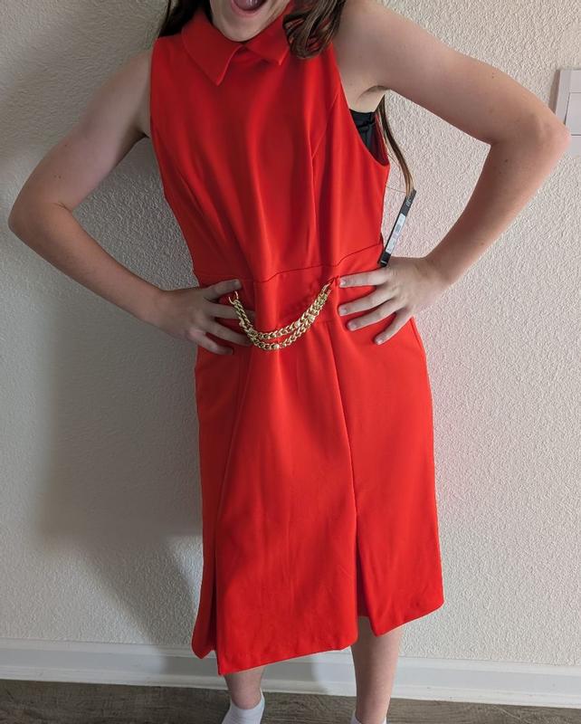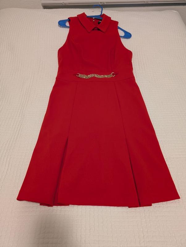 The color of this dress is so beautiful in red. I especially like the gold hardware on the belt line that gives it a glitzy look. My only complaint is that it seems to run a bit small but the quality is great!