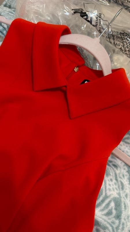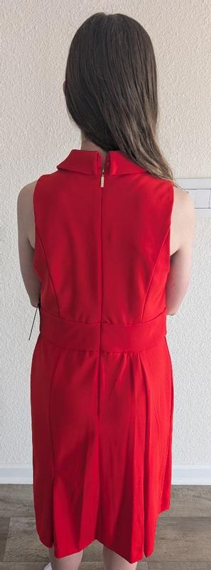 I was able to try out the Karl Lagerfeld Paris Womens Point Collar Sleeveless Dress. The dress is very bright red and well made. I would recommend this brand.