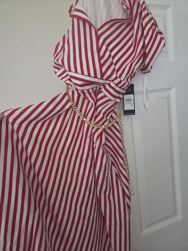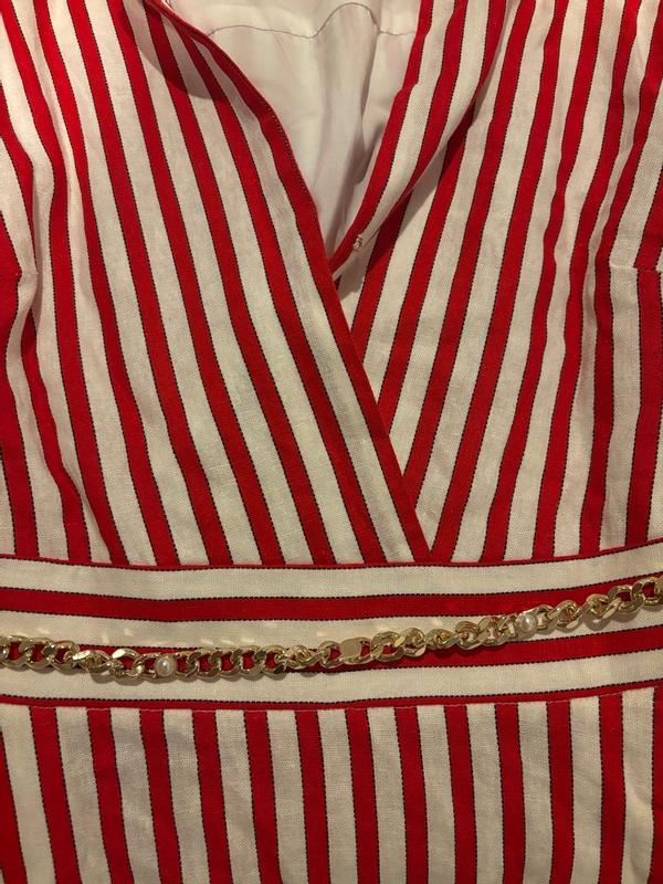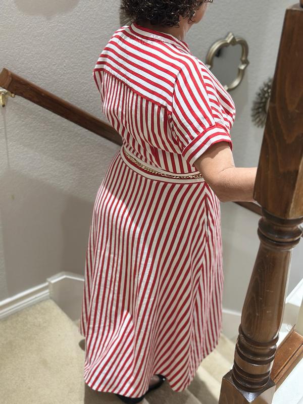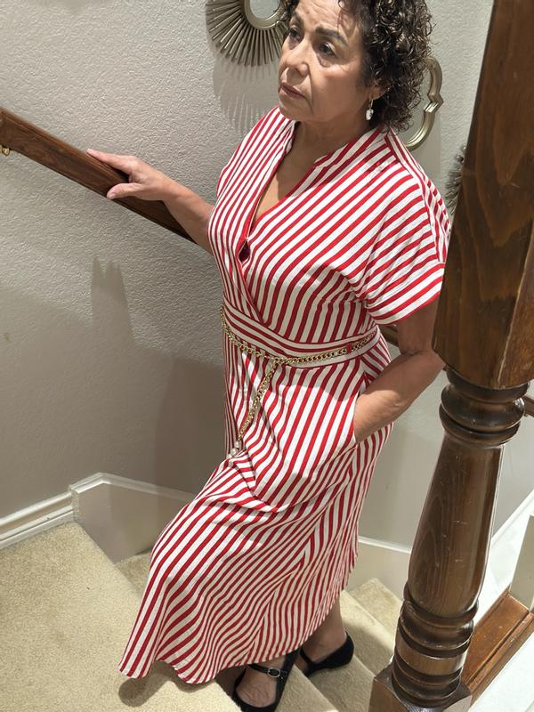 Beautiful striped dress elegant and classic, fabric soft and has a lining inside , has a beautiful chain belt that you can use for other things, very comfy and fits amazingly true in size, versatile for day and night.