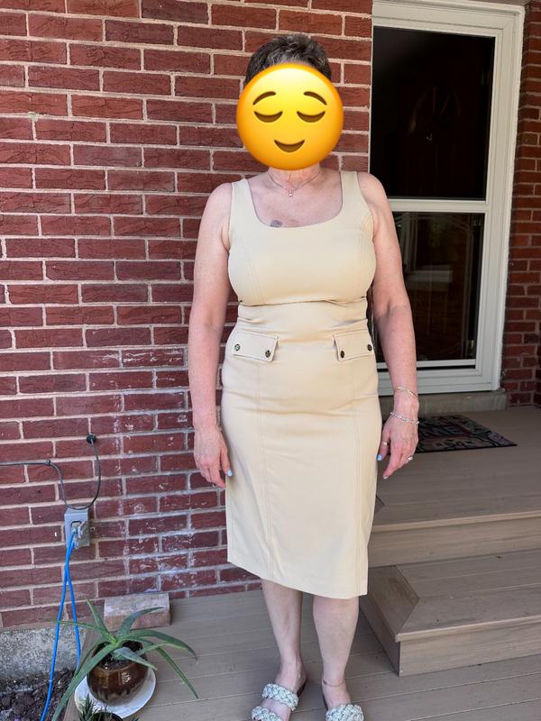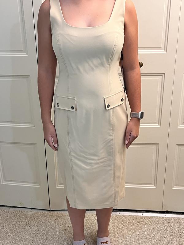 The fabric of this dress is extremely cooling and wonderful to wear in summer. It is an amazing stretch for any movement. The pockets are large and have a beautiful look to them with the hardware. The color is a wonderful tan that is modern and sleek. The fit itself didn't work for me. I am 5'5" and the dress hit me at an awkward length. I would have preferred it to be shorter.