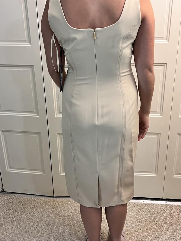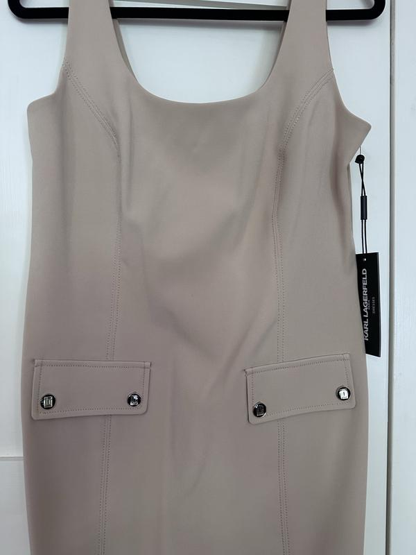 The Karl Lagerfeld Paris Sleeveless Crepe Sheath Dress embodies understated elegance with refined styling and impeccable attention to detail. Crafted with precision, it features Karl Lagerfeld Paris' signature buttons, adding an iconic flair to its minimalist design. Made with high-quality tech crepe fabric, this dress ensures a luxurious feel, flattering drape, and polished look. The square neckline, sheath silhouette, and princess seams enhance the tailored fit, while the buttoned flap faux pockets and scoop back neckline add dimension and allure. Versatile and effortlessly chic, this dress is suitable for both formal and semi-formal occasions, allowing for easy styling and accessorizing. From its timeless appeal to its commitment to quality craftsmanship, the Karl Lagerfeld Paris Sleeveless Crepe Sheath Dress is a fashion gem that exudes sophistication and confidence.