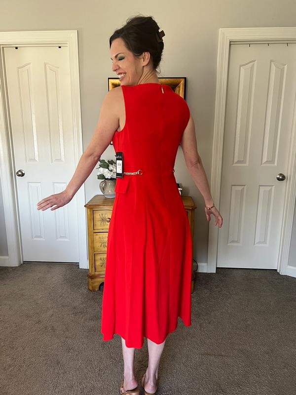 This dress looks like a cult classic in my opinion. It’s a beautiful red color and the boxy neckline is sooo flattering! The length of it is also very flattering and looks great on!! It has beautiful chain gold accents with a beautiful pearl. Super classy!