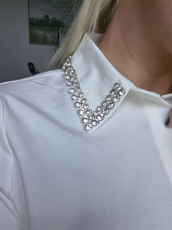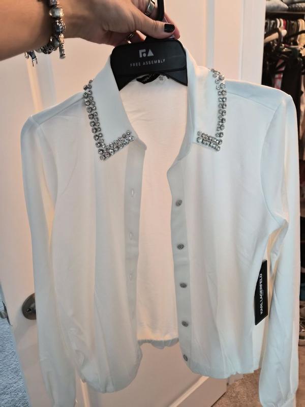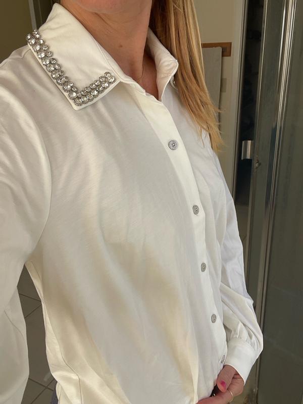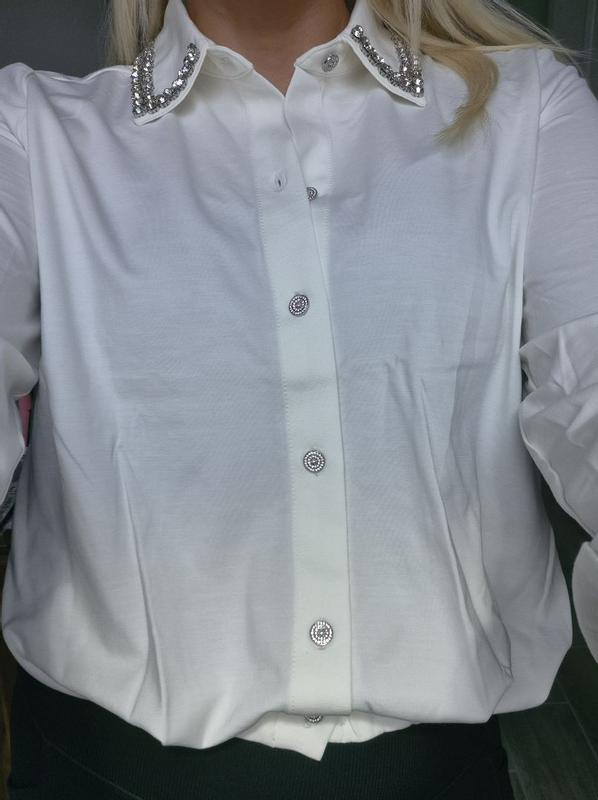 The details of this shirt are phenomenal! All these jewels on the collar make this blouse one of my new favorite! Even the buttons are made of little “diamonds”, it’s so unique! It’s obviously (at least for me) not an everyday blouse, but more so an evening wear. The material is soft, a little tighter around the waist which is a cut that i appreciate. I can wear it with high waist pants or with a skirt - either way, it’s a beautiful piece. I’ve only hand washed it, no issue so far but I am a little skeptical on how well these jewels will last in time….
