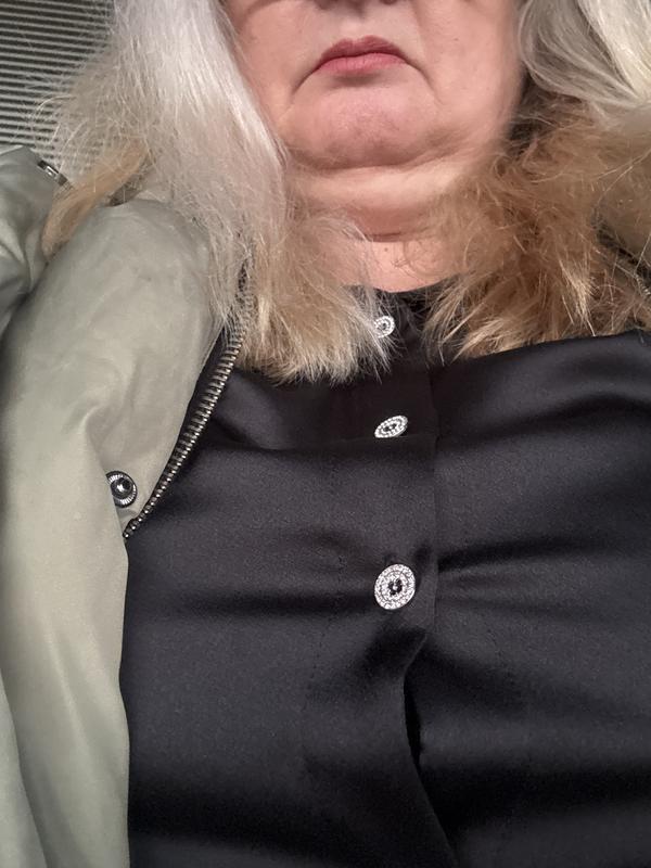 - Zipper and button closure; belt loops