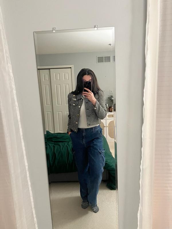 This jacket is super nice. The material is a nice textured tweed that feels thick and expensive. The jacket is lined with a black silk-like material. I love the little details like the pins on the jacket and the different buttons. It is perfect for dressing up for a holiday party or dressing down with jeans and some sneakers for a more casual look. One thing is I would size up. I had sized up to get an oversized fit and it ended up fitting perfectly just as an fyi. Other than that a very high quality jacket.