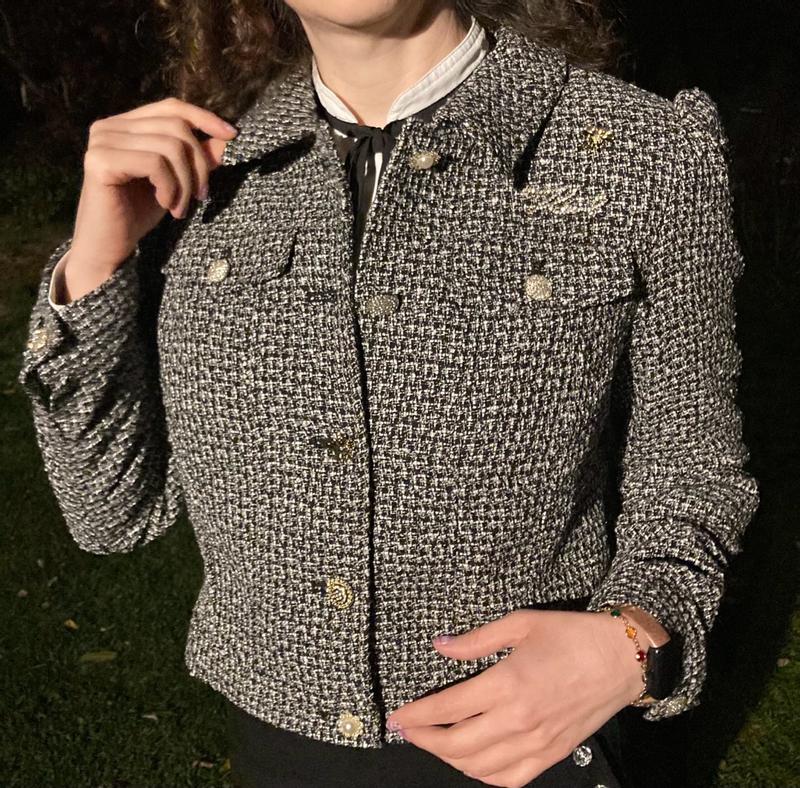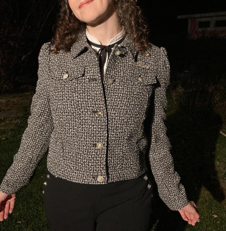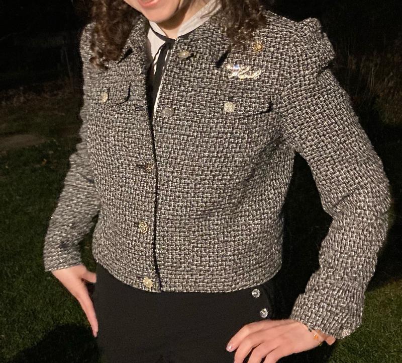 What am amazing find!! Where style meets quality. The material feels soft and warm , the embellishments are making these jacket truly Fashion forward. I have worn already a couple of times feels the size fit is perfect. Done already a dry cleaning and its durability is great! After almost a daily wear feels brand new!!! Gotten tons of compliments . Worn with jeans for casual outfit as well a pencil skirt for the office. Both looks were a fantastic choices!!