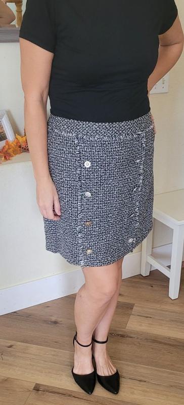 This skirt is super cute for work. Length and tweed style is great. The only thing I am not a fan of are the gold button type jewels on it. They take away from the classic style. Overall cute skirt.