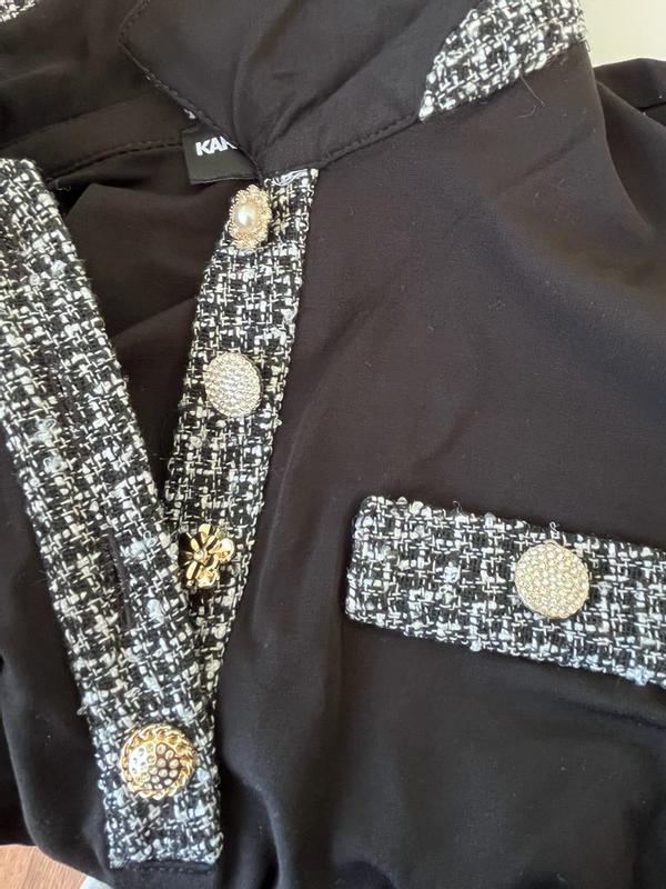 I can always count on Karl Lagerfeld for classic, day-into-night dresses. This dress is excellent quality and fits true to size. There is a slight amount glitter around the buttons that adds a nice touch, which is not visible in the photos. Instant favorite.