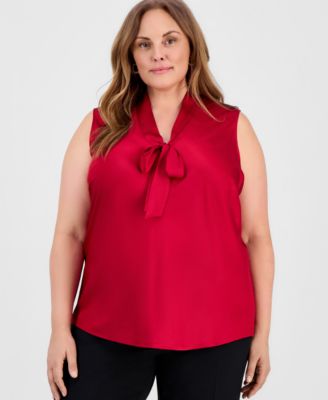 Kasper's plus size satin top features a soft, fluid silhouette accented by a slender self-tie at the neck for a touch of polish.
