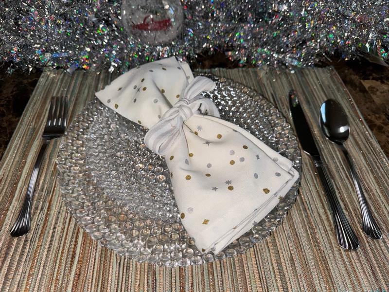 These napkins add such and elegant touch to any table for a party or whatever occasion you use them for. The design is simple, but pops with the gold and silver against the white background. The napkins are thick and durable and hold up well to any mess any and washing.