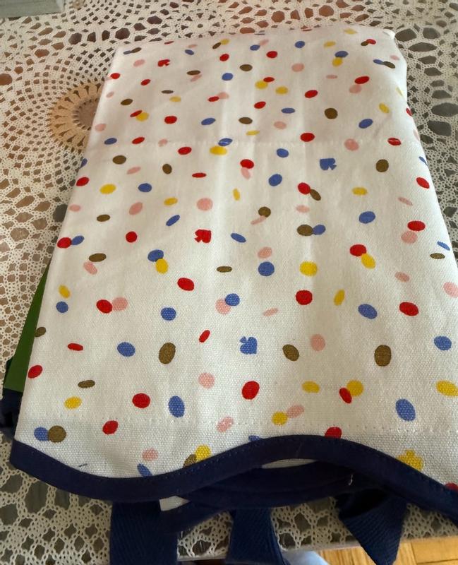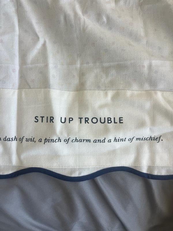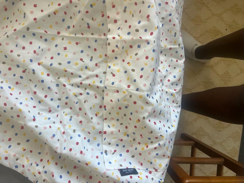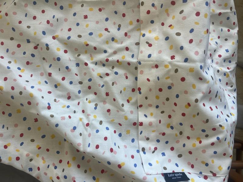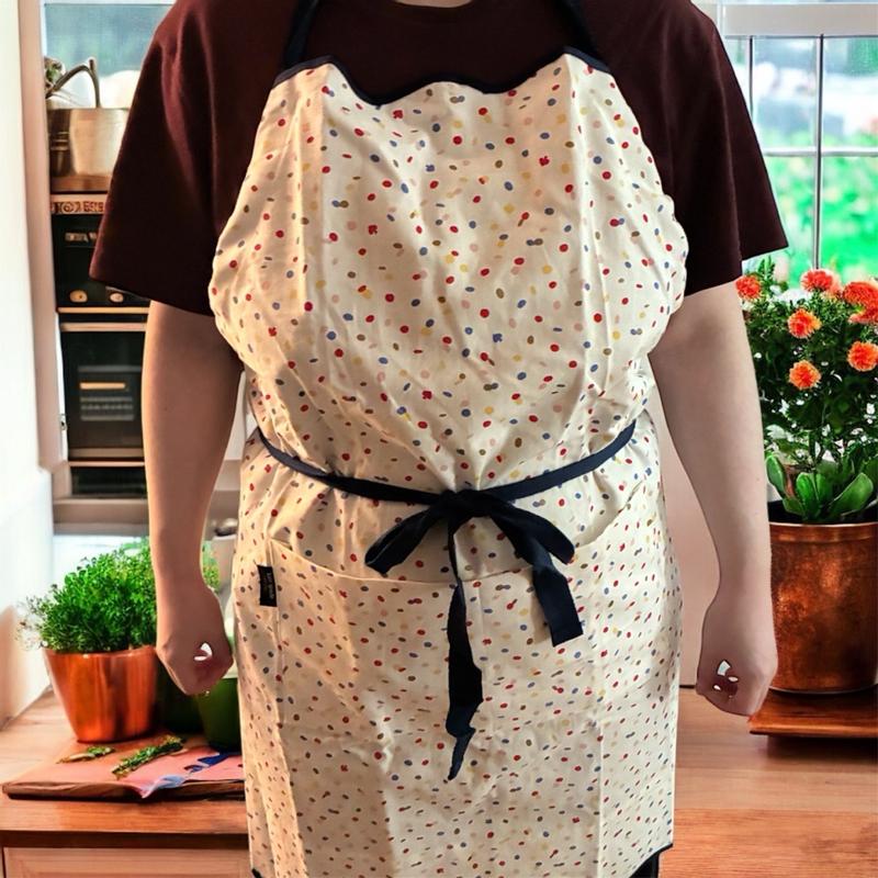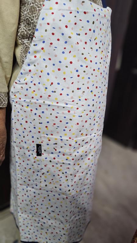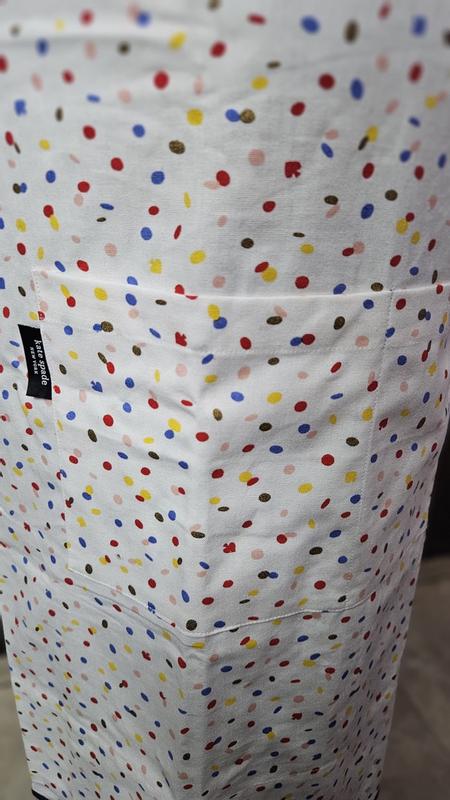 Kate Spade New York Sparkling Confetti Apron Double Pockets is cute and stylish. It’s made extremely well. Love that it fits comfortably. Material is much thicker than expected. Which is great so liquid or food doesn’t leak through to clothing. The polka dots are pretty and fun. The pockets are a plus because you never know when you’re going to need to put something in them. You can also stretch the apron by pulling the apron strings. Which is great if you have small children. The Kate Spade Apron is excellent value for your money. One added thing I like is the quote on the inside of this apron. I think it would make an excellent gift for that friend who loves to cook or bake. It’s 100% cotton machine washable cold , Gentle with like colors.